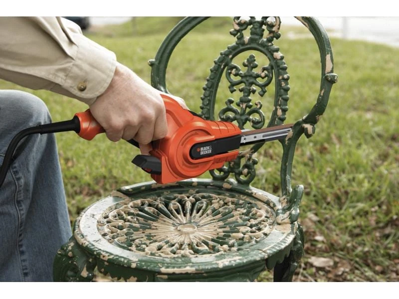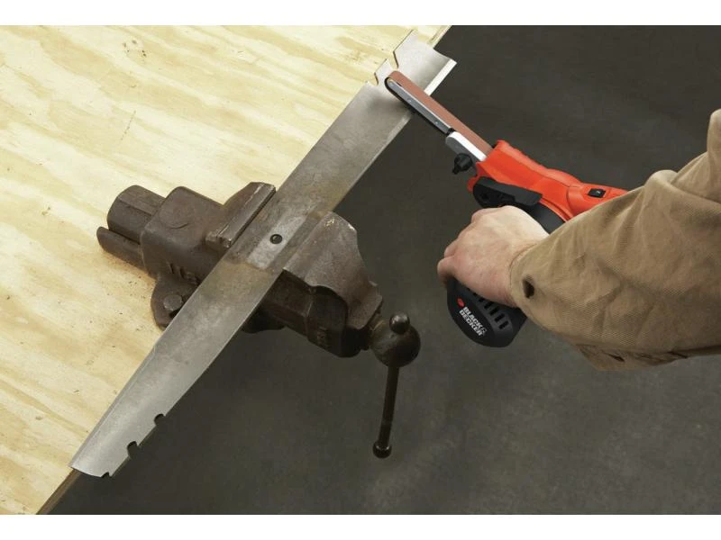 Mit der Powerfeile KA900E von BLACK+DECKER können Sie Holz, Metall, Keramikfliesen, Stein, Gips und auch Kunststoff schleifen und feilen. Auch Formen, Schärfen und Entrosten ist möglich, dank des 13-mm-Schleifbandes, das an einem geraden und schmalen Schleifarm befestigt ist, der auch an schwer zugänglichen Stellen benutzt werden kann. Das Bandzentrierungssystem verhindert, mittels einer Schraube, weiterhin das Abrutschen des Schleifbandes im Schleifprozess. Der Materialabtrag wird aufgrund des 350-W-Motors schnell und genau ausgeführt. Die Drehzahl können Sie variabel einstellen.