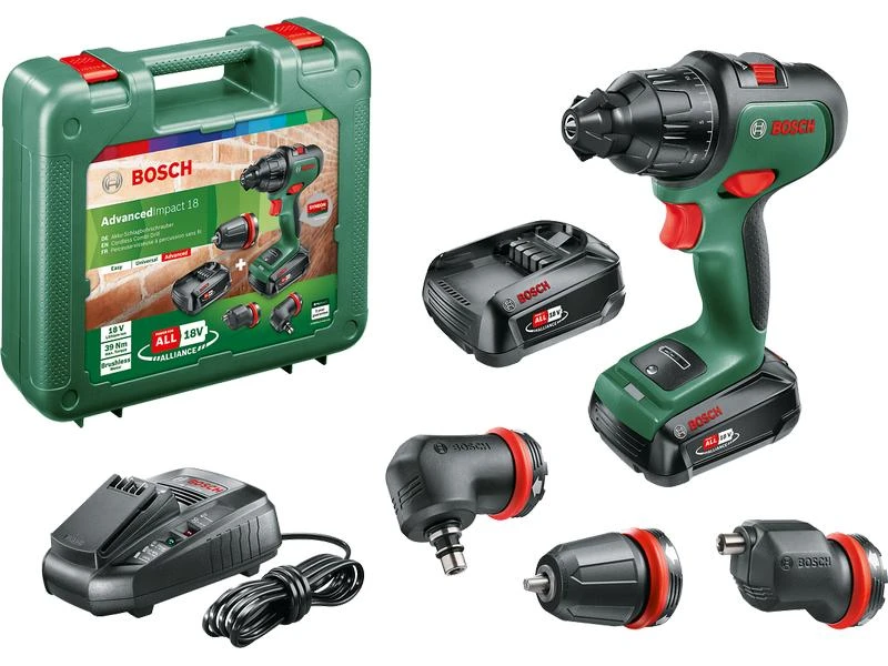 Der Bosch Zweigang-Akku-Schlagbohrschrauber AdvancedImpact 18 ist intuitiv in der Bedienung und vielseitig einsetzbar für jede Anwendung. Damit können die unterschiedlichsten Aufgaben in den Bereichen Holz, Kunststoff und Metall ausgeführt werden. Die Wahl des gewünschten Modus zum automatischen Einstellen der Gänge zum Schrauben oder Bohren ist einfach. Dank des innovativen elektronischen Schaltsystems mit LED-Licht kann die Drehrichtung mit einem einfachen Klick gewechselt werden. Der bürstenlose Motor bietet Leistung, Kompaktheit und Langlebigkeit. Dank einer Magnetkappe zum Schrauben und einem 13-mm-Futter zum Bohren gestaltet sich der Wechsel zwischen den Anwendungsbereichen noch einfacher.
