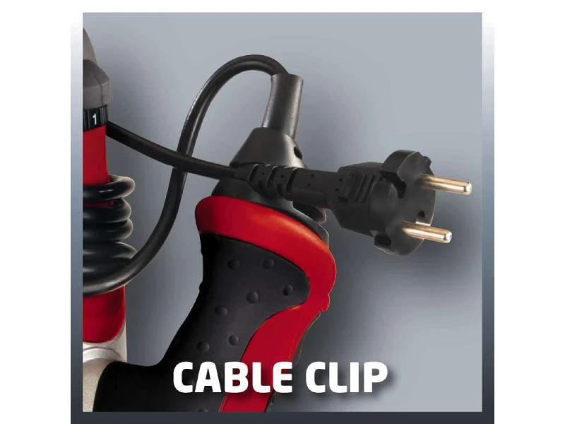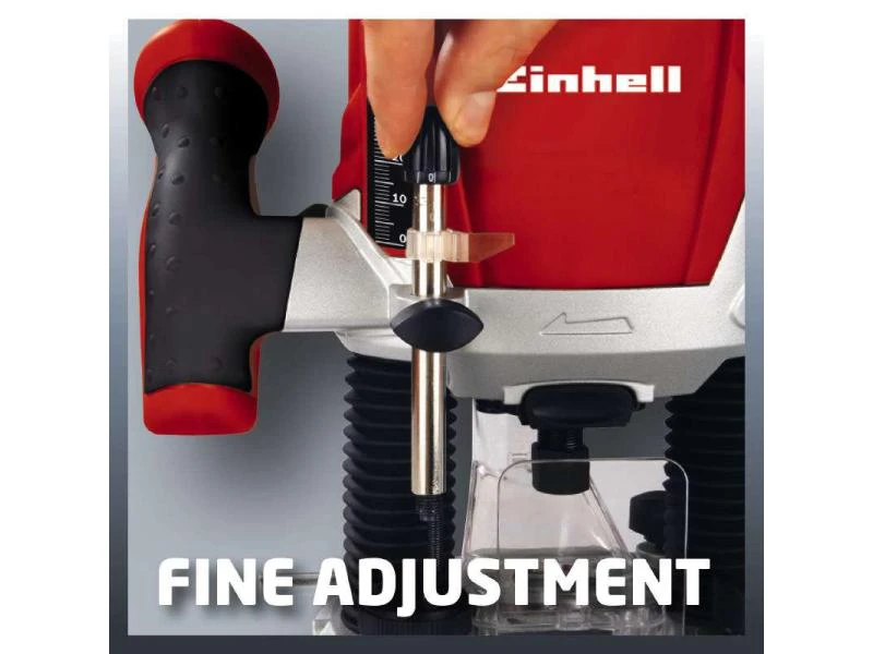 Die Oberfräse RT-RO 55 von Einhell liegt äusserst gut in der Hand. Die ergonomischen Griffe liegen angenehm in der Hand. Der Arretierhebel ist leicht zu erreichen und gewährleistet eine einfache und sichere Bedienung. Die Frästiefe lässt sich leicht über drei Revolveranschläge einstellen und mittels Tiefeneinstellung exakt nachjustieren. Ein Späneschild schützt den Benutzer und der Kabelclip fixiert das Elektrokabel nach getaner Arbeit.
