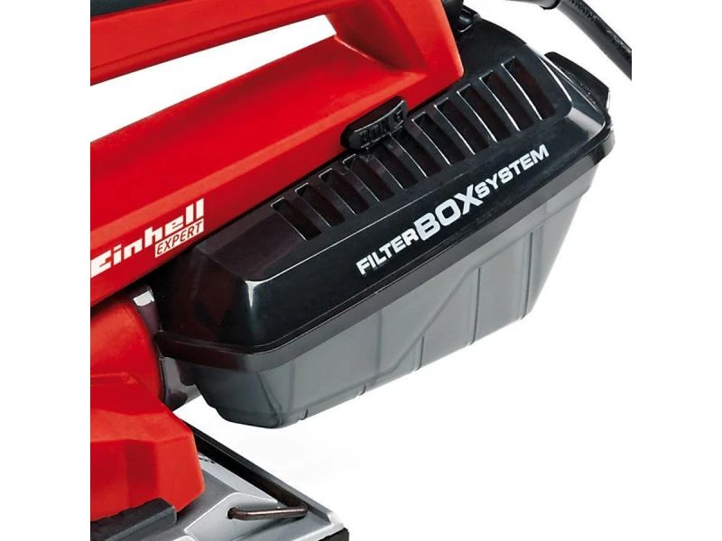 Der Schwingschleifer erlaubt dank aktiver Staubabsaugung ein staubarmes Arbeiten. Der anfallende Schleifstaub wird in einer praktischen Filterbox gesammelt. Durch den Anschluss eines Saugers kann die Sauberkeit beim Arbeiten noch weiter gesteigert werden.
