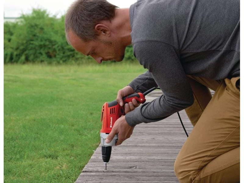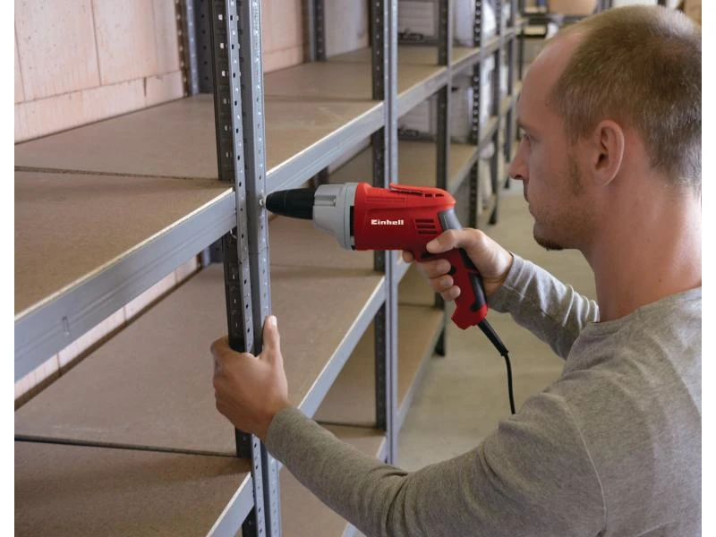 Der Trockenbauschrauber TH-DY 500 E von Einhell eignet sich ideal zur Montage von Gips- und Spanplatten. Er ist mit einem Auto-Start-Stopp-Getriebe ausgestattet, welches die Spindel erst dreht, wenn die Schraube angesetzt ist und bei bündigem Sitz automatische stoppt. Zudem sorgt der Getriebekopf aus Metall für einen langlebigen und zuverlässigen Betrieb. Ausserdem verfügt das Gerät über einen Rechts- und Linkslauf sowie eine Drehzahl-Regelelektronik mit Drehzahlvorwahl. Des Weiteren ist der Trockenbauschrauber mit einer magnetische ¼“ Innensechskant-Werkzeugaufnahme versehen, welche eine schnelle Aufnahme der Bits. Für ein komfortables Arbeiten lässt sich der TH-DY 500 per Feststellknopf auf Dauerbetrieb umschalten. Falls Sie das Gerät gerade nicht benutzten, können Sie es einfach am praktischen Gürtelhaken befestigen.