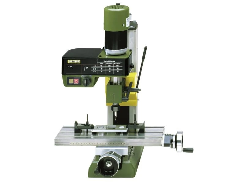 Die Feinfräse FF 500 ist ein ideales Bearbeitungszentrum zum Senken, Bohren und Fräsen. Dabei ist der Fräskopf um 90 Grad nach links und rechts schwenkbar. Der Kreuztisch ist aus massivem Stahl und beinhaltet 3 durchgehende T-Nuten.
