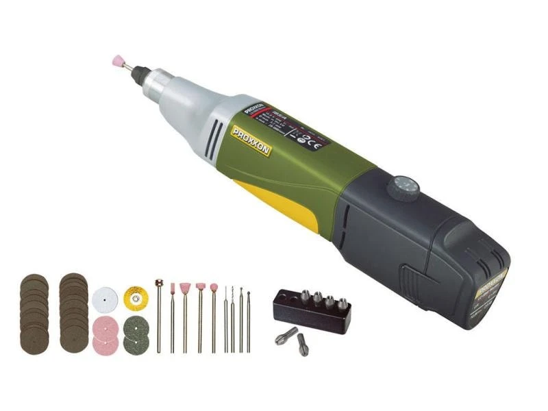 Der Akku-Industrie-Bohrschleifer IBS/A von Proxxon ist in einem sehr handlichen Gehäuse verbaut worden und kann vielfältig eingesetzt werden. Die schlanke Form und die weiche Grifffläche sorgen für ein angenehmes Handgefühl bei der Arbeit. Erledigen Sie Bohr-, Schleif, Fräs-, Polier- und Reinigungsarbeit noch effektiver und punktgenau. Auch zum Trennen, Gravieren und Signieren ist das kompakte Gerät geeignet. Das Herzstück bildet der balancierte DC-Spezialmotor. Dieser ist durchzugskräftig, sehr leise im Betrieb und langlebig. Der Motors erreicht zwischen 7000 und 23’000 U/min.
