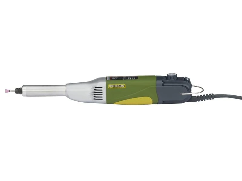 Der dank des 75 mm langen und schlanken Spindelhalses vor allem für Innenschliffe in Bohrungen oder Kanälen geeignete, 630g leichte Langhals-Bohrschleifer wird von einem leisen, durchzugskräftigen und langlebigen DC Spezialmotor angetrieben. Die Drehzahl ist stufenlos in einem Bereich von 5000 bis 20’000 rpm regulierbar.